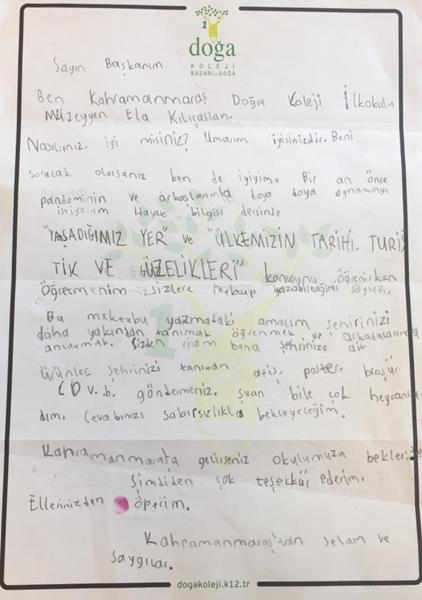 Kahramanmaraş Doğa Koleji İlkokulu 1. sınıf öğrencisi Müzeyyen Ela Kılıçaslan Hayat Bilgisi dersi kapsamında Ordu Büyükşehir Belediye Başkanı Dr. Mehmet Hilmi Güler’e mektup yazdı. Öğrenci Kılıçaslan mektubunda Ordu’yu yakından tanımak için şehre ait materyallerin gönderilmesini istedi
