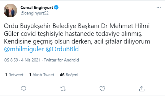 Ordu Büyükşehir Belediye Başkanı Hilmi Güler, korona virüs nedeniyle hastaneye kaldırıldı. Haberi Demokrat Parti Ordu Milletvekili Cemal Enginyurt paylaştı