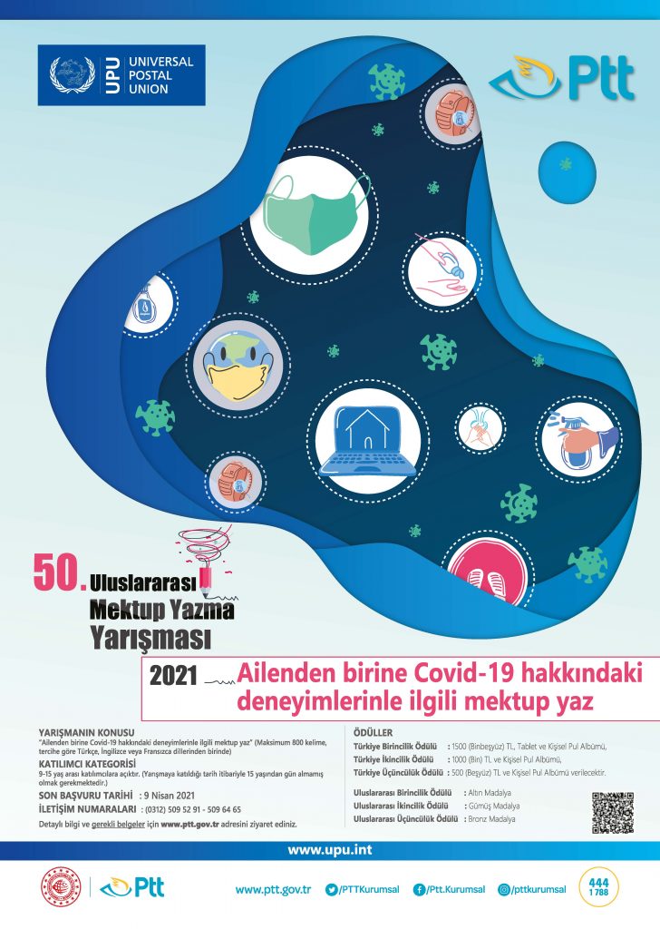 Dünya Posta Birliğinin (UPU) düzenlediği “Uluslararası Mektup Yazma Yarışması'nın" konusu bu yıl, "Ailenden Birine Kovid-19 Hakkındaki Deneyimlerinle İlgili Mektup Yaz" oldu. Türkiye'de PTT AŞ tarafından organize edilen yarışmaya katılacak olan 9-15 yaş arası gençlerden dereceye girenlere, çeşitli ödüller verilecek