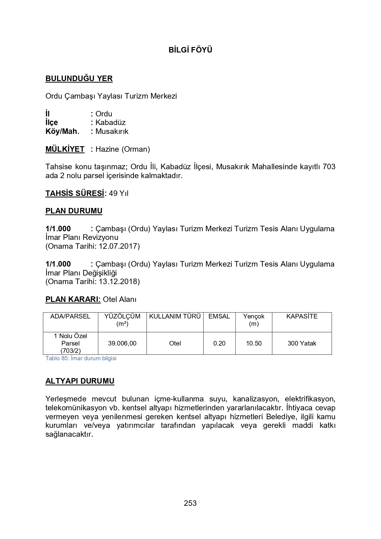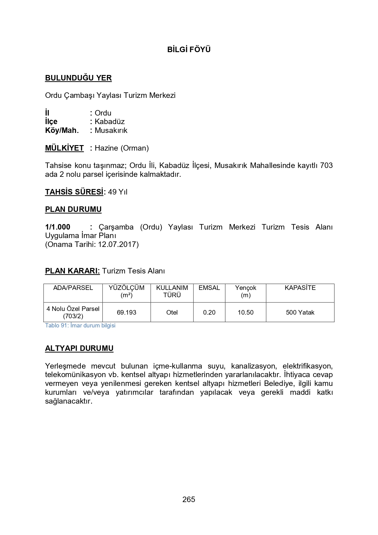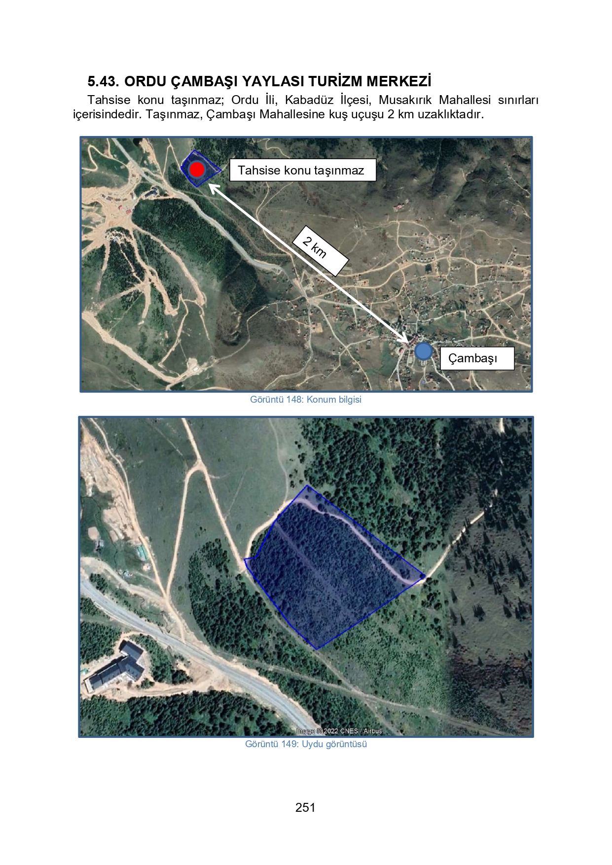 Kültür ve Turizm Bakanlığı tarafından Afyonkarahisar, Antalya, Aydın, Bursa, Denizli, Erzincan, Hatay, İzmir, Kars, Mersin, Muğla, Niğde, Ordu, Trabzon, Yalova ve Nevşehir illerinde bulunan bazı kamu taşınmazları Kamu Taşınmazlarının Turizm Yatırımlarına Tahsisi Hakkında Yönetmelik hükümlerine uygun olarak girişimcilere tahsis edilecek.Girişimcilerin, 19 Ağustos 2022 günü saat 16:30’a kadar istenilen bilgi ve belgeleri Kültür ve Turizm Bakanlığı’na elden teslim etmeleri gerekmektedir.Bu tarihten sonra veya posta yoluyla yapılan başvurular dikkate alınmayacak.Girişimciler, birden fazla taşınmaz için müracaat edebilecek.Tahsise konu taşınmaz; Ordu İli, Kabadüz İlçesi, Musakırık Mahallesi sınırları içerisindedir. Taşınmaz, Çambaşı Mahallesine kuş uçuşu 2 km uzaklıktadır.