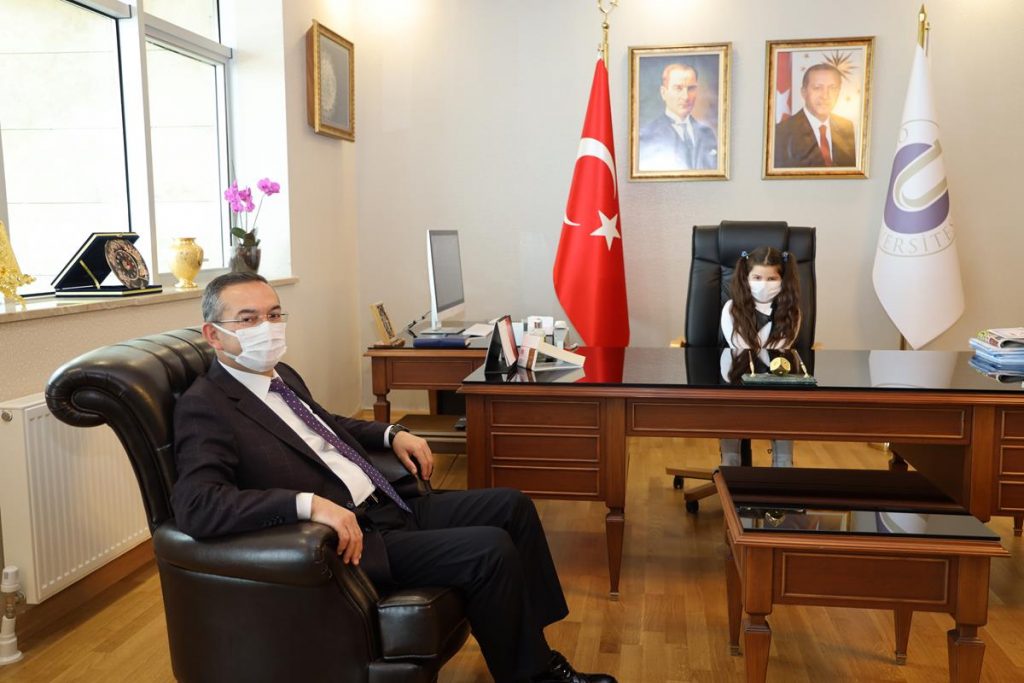 23 Nisan Ulusal Egemenlik ve Çocuk Bayramı kutlamaları kapsamında gerçekleştirilen devir teslim töreninde Rektör Prof. Dr. Ali Akdoğan, koltuğunu Düriye Çetinceviz Anaokulu öğrencisi Asel Gönül’e devretti.